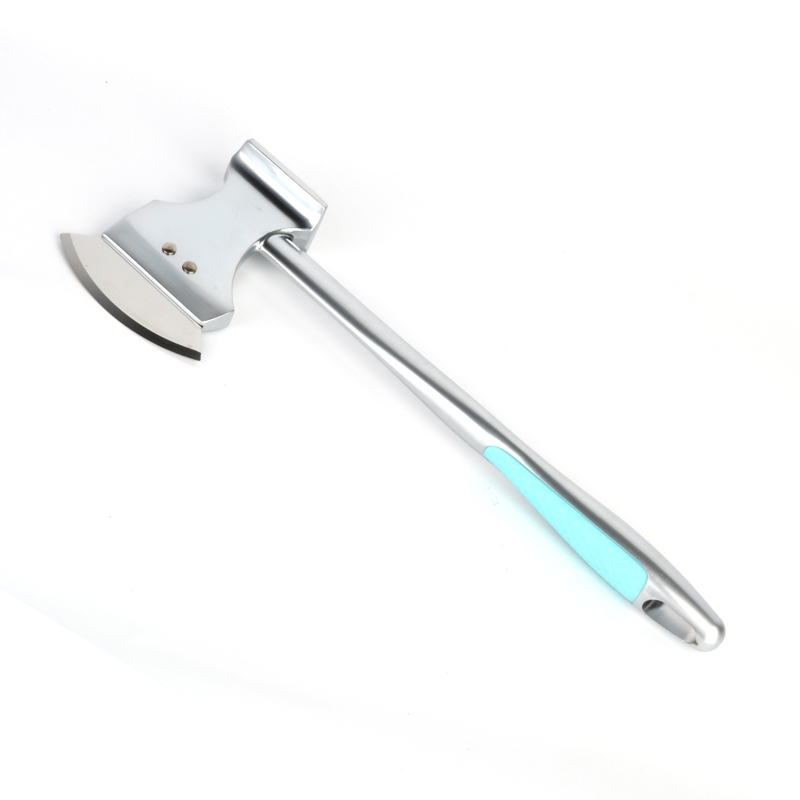 The blade of the pizza cutter is made of high-quality 304 stainless steel, and its design is inspired by the shape of an axe,iving it a more practical and visually appealing appearance.The tool is of moderate weight,making it easy to use and versatile in its functions.Whether used as a meat tenderizer or for cutting pizza,the blade can also be used to remove meat bones and fascia or even as a fruit knife for chopping vegetables and fruits when no other knives are available.