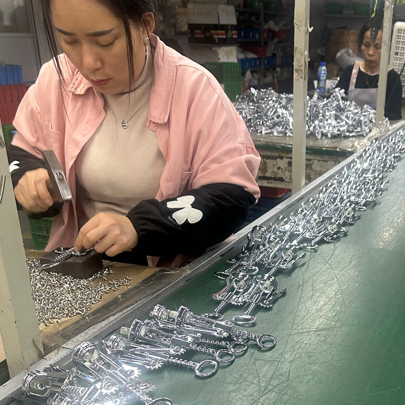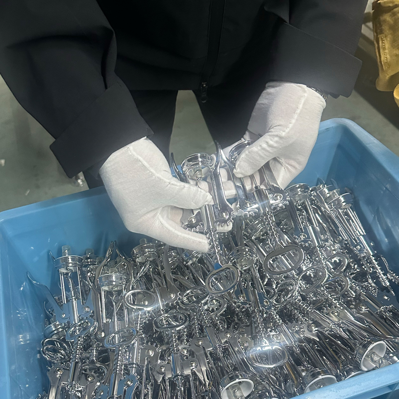 Tota corkscrew pervenit ad suum processum finalem, qui est conventus. Primum, distinguimus omnes semi-perfectas partes processus per genus componentium. Quality Control (QC) personas inspectiones praevias ducere ad confirmandum has partes semi-perfectas omnes productas specificationes ad functionem, colorem et superficiem qualitatem conveniant. Qualified et defectiva partes tunc separantur et administrantur singulatim. Inspectio relationum generantur et subiciuntur ad productionem speciei. Manuale, partes semi-perfectae in inventario reponuntur et postea lineam productionis ingrediuntur ad conventum.