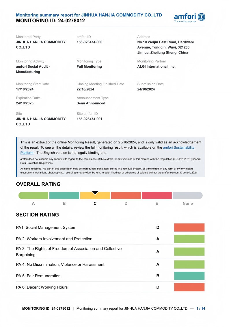 In July MMXXV:Jinhua Hanjia mercimonia Co., Ltd.Feliciter adeptus A C-Level Certification in Internationalis Classification Signa (ICS) Factory Audit Program, deduxit per Tertium-Party Europae inspectionem Agency constituit per cooperantem Enseigne. This certification system comprises four tiers: A, B, C, and D. As a member of the French Chamber of Commerce and Industry (FCD), the company adheres to the International Labour Organization's Social Management Scheme standard SA8000, implementing social responsibility audits on its suppliers.The audit scope covers critical areas including human rights, occupational health and safety, factory conditions, wages, and documentation compliance.